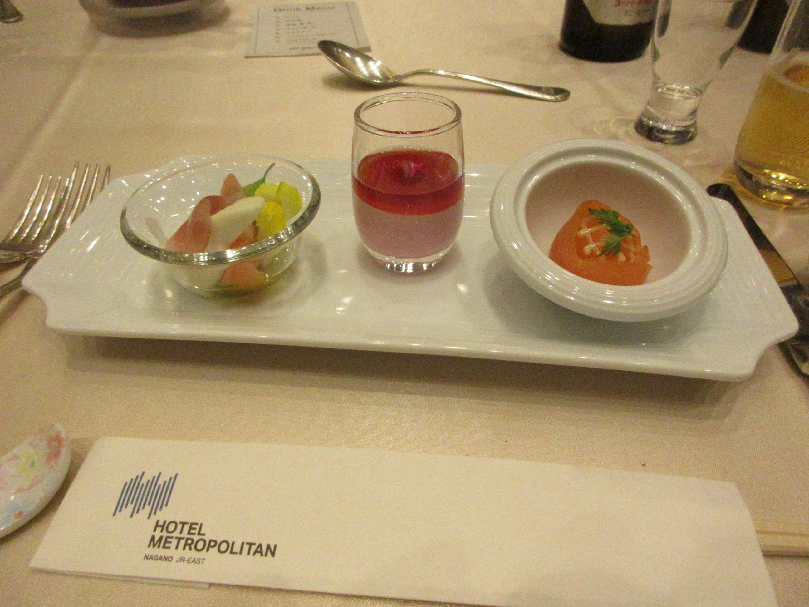 懇親会の席には、長野県の地元食材を使ったコース料理が出ました。これまでのサミットではビュッフェ方式でしたが、コース料理として提供できるのは、メニューの工夫が凝らされていて、素晴らしいことだと思いました。